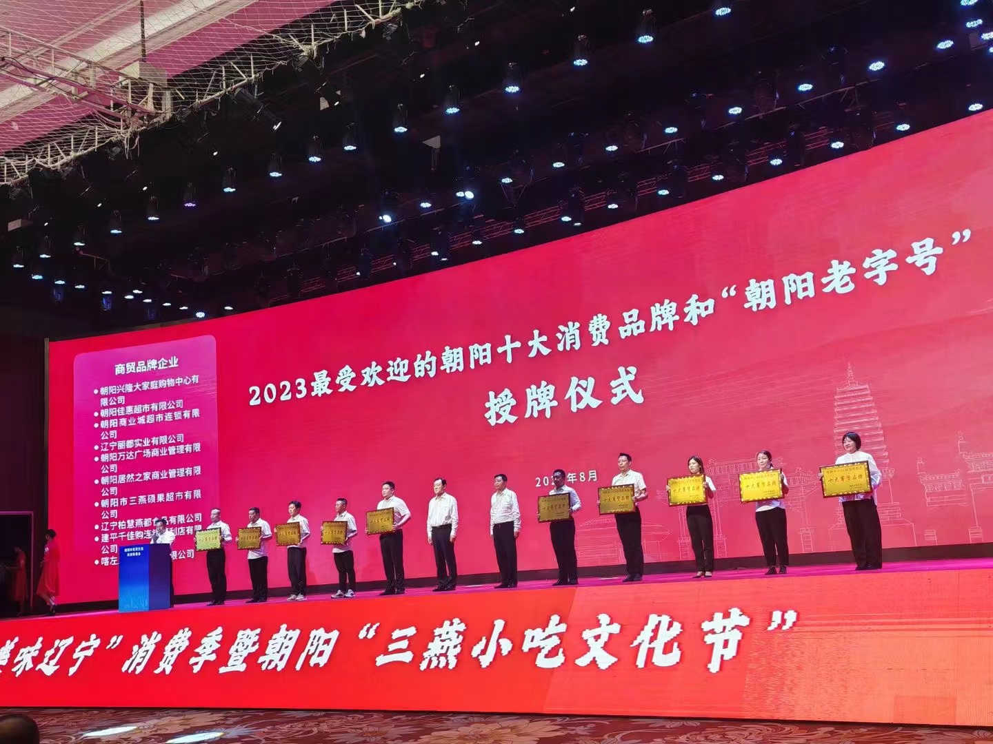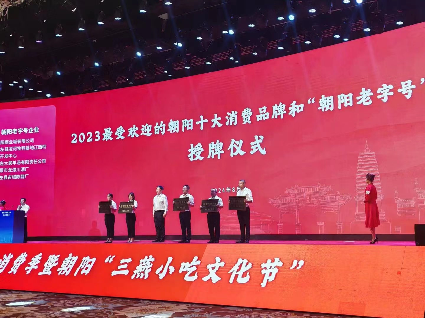 2024年8月28日朝陽市舉行了隆重的“2023最受歡迎的朝陽十大消費(fèi)品牌和‘朝陽老字號(hào)’授牌儀式”,朝陽市委書記單義向朝陽商業(yè)城有限公司頒發(fā)了“朝陽老字號(hào)”牌匾,朝陽市政協(xié)主席劉朝震向朝陽商業(yè)城超市連鎖有限公司頒發(fā)了“十大商貿(mào)品牌”牌匾。